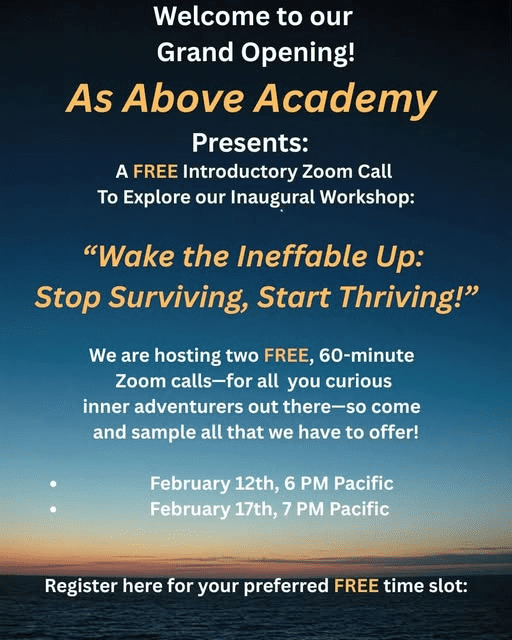 This Thursday, Feb 12th, & next Tuesday, Feb 17th! Join As Above Academy in a FREE exploratory Zoom session, in which we introduce you to our upcoming course, "Wake the Ineffable UP: Stop Surviving, Start Thriving!"